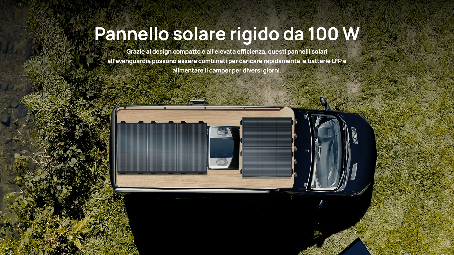 Grazie ai fori già predisposti, il pannello rigido da 100 W è pronto per essere montato su un furgone o su una struttura off-grid. L'abbinamento con i piedini di montaggio per pannello solare rigido da 100 W consente di fissarlo saldamente a qualsiasi superficie.