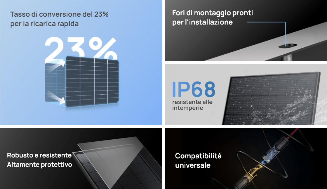 Il nostro pannello solare rigido da 100 W ha un eccellente tasso di conversione del 23%, consentendo una ricarica ancora più rapida. Combinando questi pannelli con la propria configurazione di Power Kits o la power station portatile EcoFlow, l'algoritmo MPPT integrato ottimizzerà l'ingresso di luce solare.