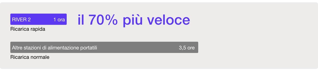 RIVER 2 supera lo standard del settore in termini di velocità di ricarica, ricaricandosi completamente in soli 60 minuti*¹. È il 70% più veloce rispetto alle altre stazioni di alimentazione portatili sul mercato e il 38% più veloce rispetto alle generazioni precedenti. Ricarica completamente RIVER 2 mentre prepari le valigie, così sarai sempre pronto per un viaggio dell'ultimo minuto.