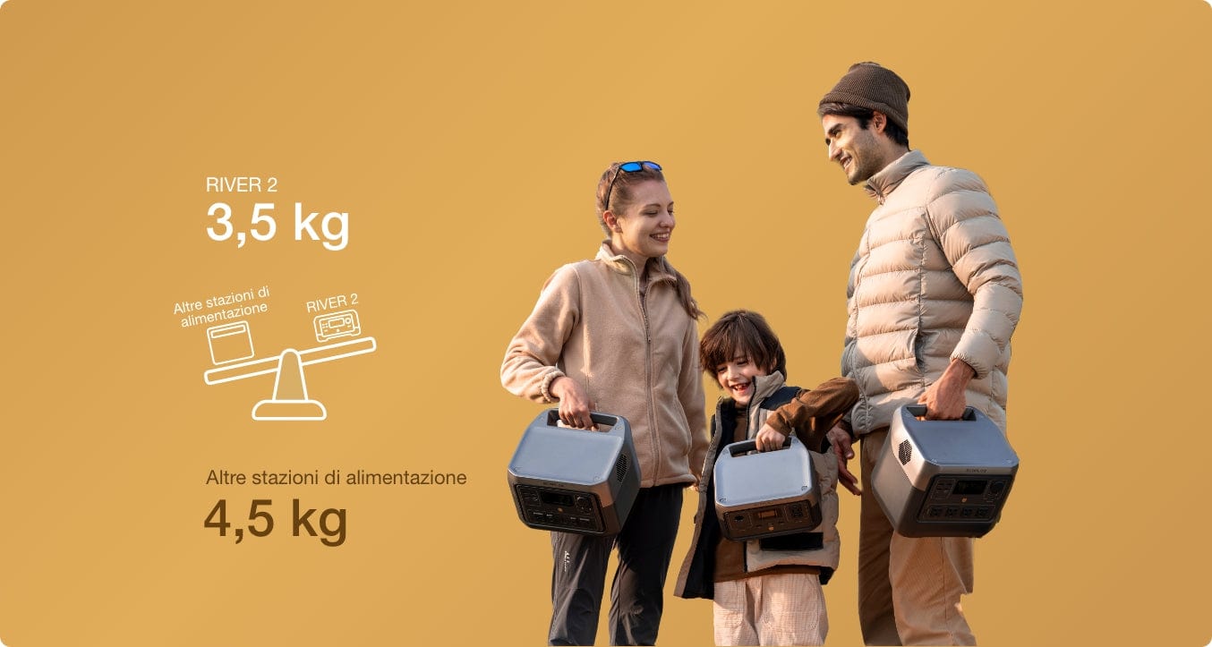 Grazie a un design compatto e portatile, usufruire di un'alimentazione da viaggio off-grid non è mai stato così facile. Con un peso ridotto, minore del 30% rispetto alla norma del settore, RIVER 2 è pronta ad alimentare tutte le tue avventure all'aperto, dal campeggio libero ai barbecue in spiaggia.