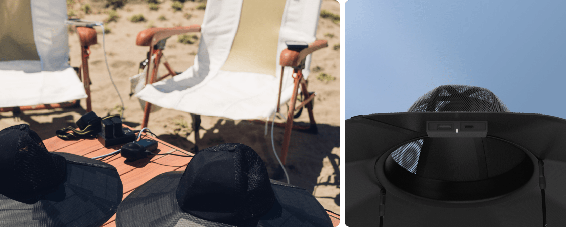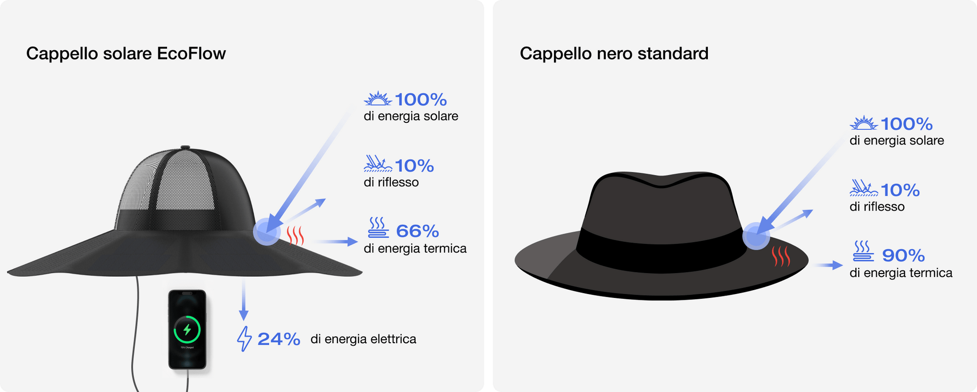 Durante il processo di ricarica, i pannelli solari sulla tesa del cappello convertono il 24% dell’energia solare assorbita in elettricità, con una riduzione al 66% dell’energia convertita in calore. Rispetto a un normale cappello di colore nero, ha una temperatura superficiale inferiore e garantisce così una maggiore freschezza.