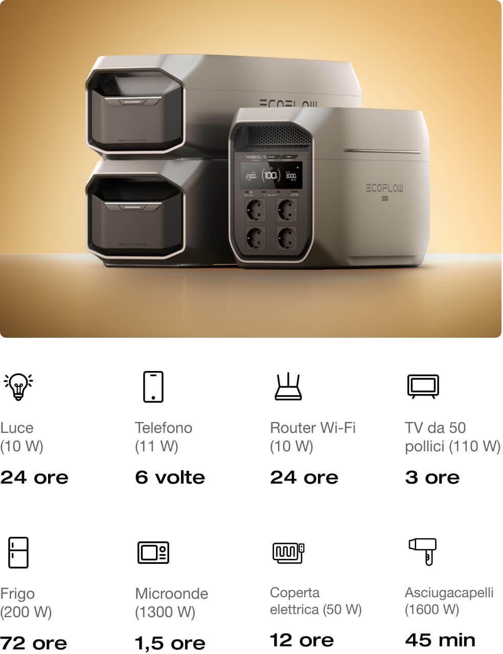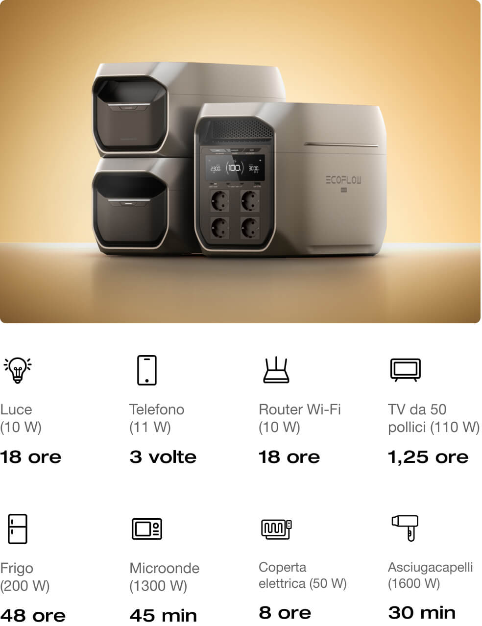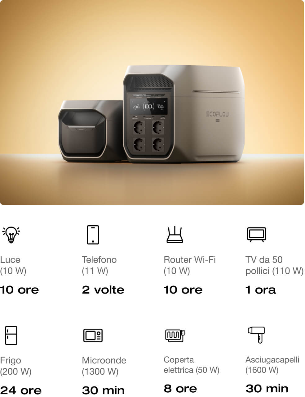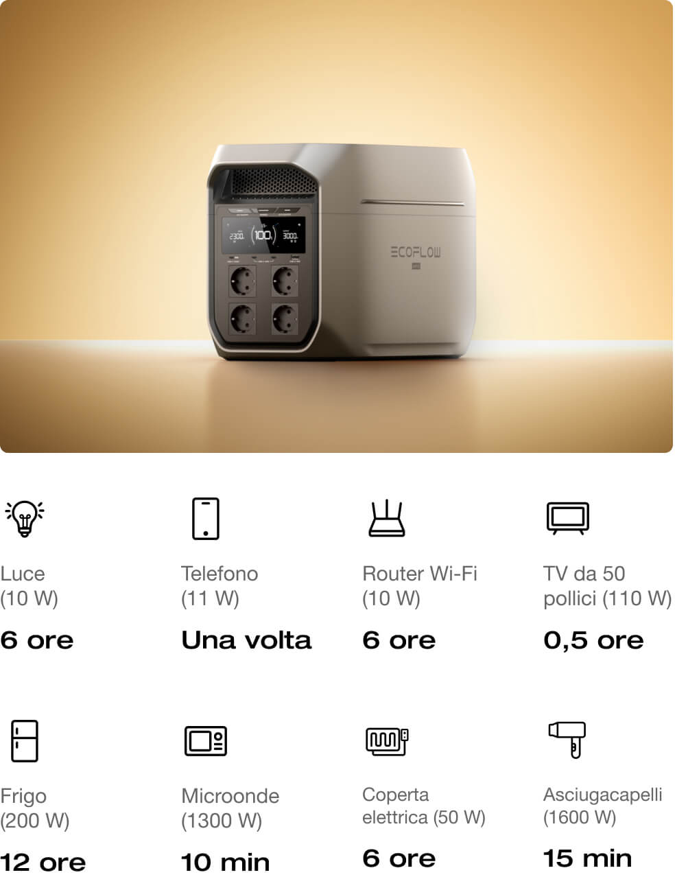 DELTA 3 Max Plus eroga una potenza in uscita di 3000 W, sufficiente per far funzionare contemporaneamente il microonde, il bollitore, il frigorifero e il frullatore senza interruzioni. Ora di pranzo? Vai a tutto gas. Niente spine da staccare, nessuna interruzione — solo energia continua. [4]