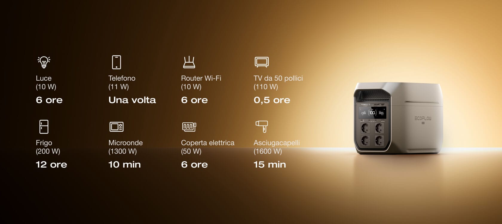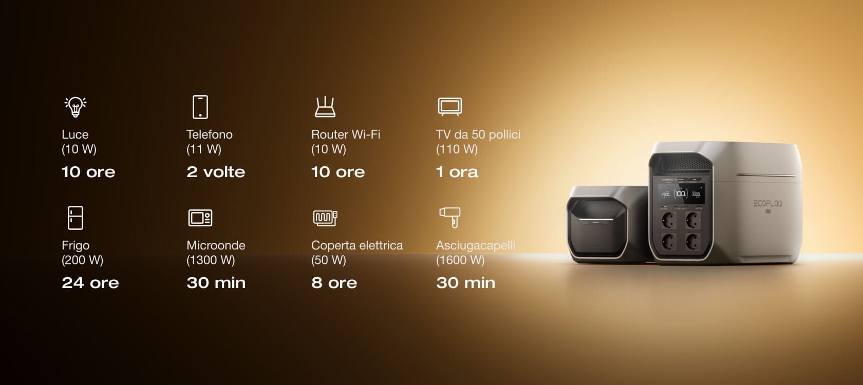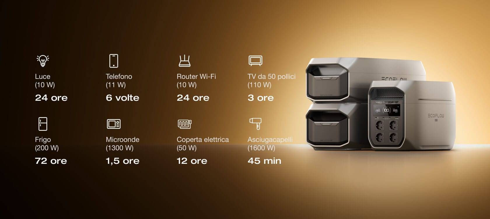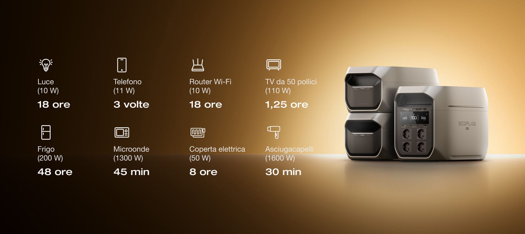DELTA 3 Max Plus eroga una potenza in uscita di 3000 W, sufficiente per far funzionare contemporaneamente il microonde, il bollitore, il frigorifero e il frullatore senza interruzioni. Ora di pranzo? Vai a tutto gas. Niente spine da staccare, nessuna interruzione — solo energia continua. [4]