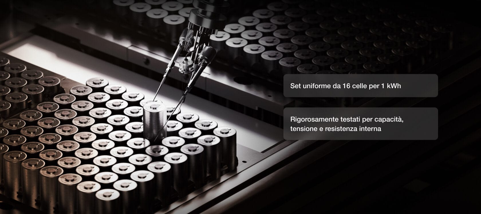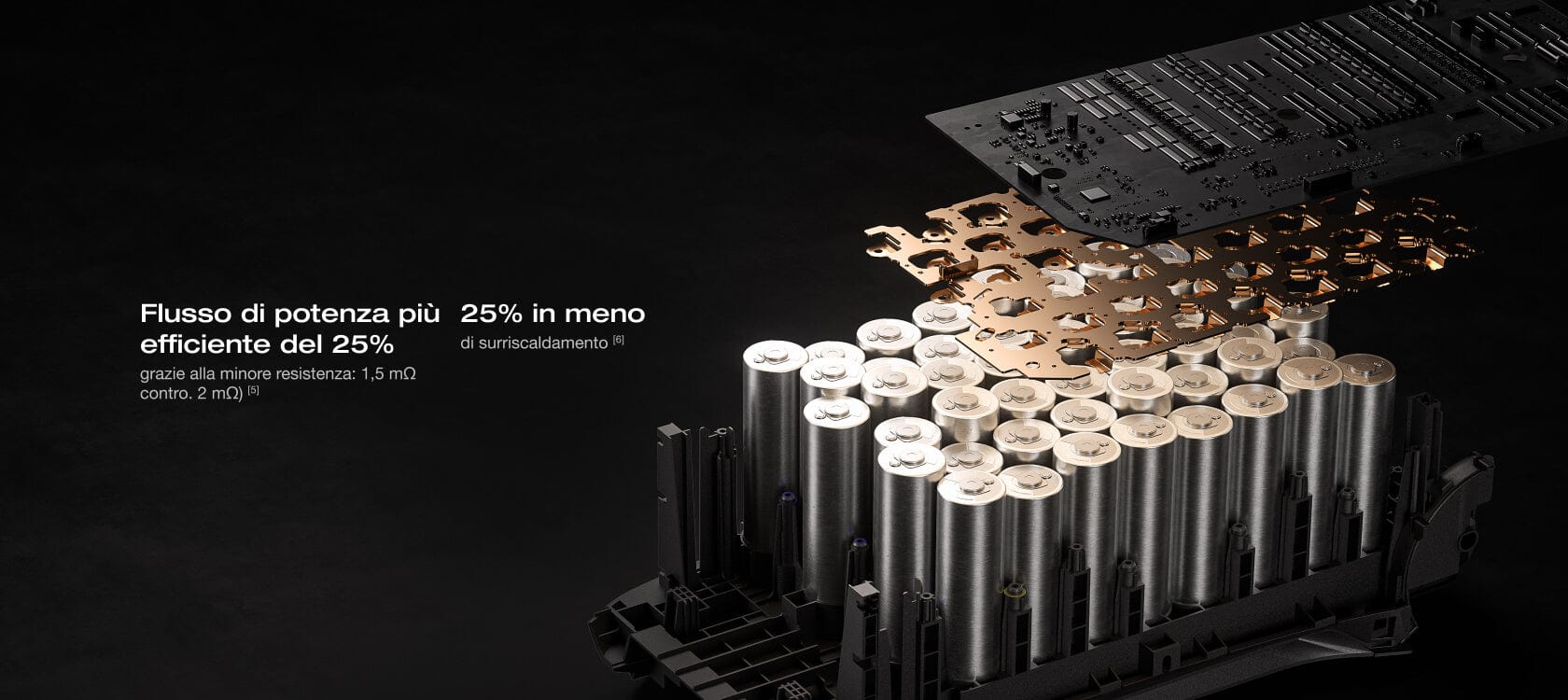 Con il 27% in meno di celle per kWh, [7] il nostro design a 16 celle funziona a temperature più basse, dura più a lungo ed offre maggiore stabilità. Ogni cella viene rigorosamente testata per verificarne capacità, tensione e resistenza interna, ottenendo così un pacco estremamente uniforme che protegge da sovraccarichi, squilibri e usura prematura.